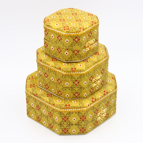 ชุดกล่องแปดเหลี่ยม 3 ใบ ผ้าพิมพ์ทองลายไทยสีเหลือง