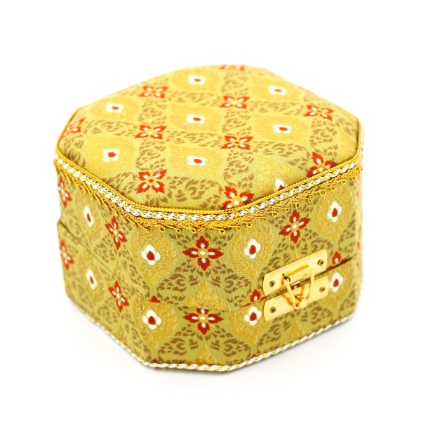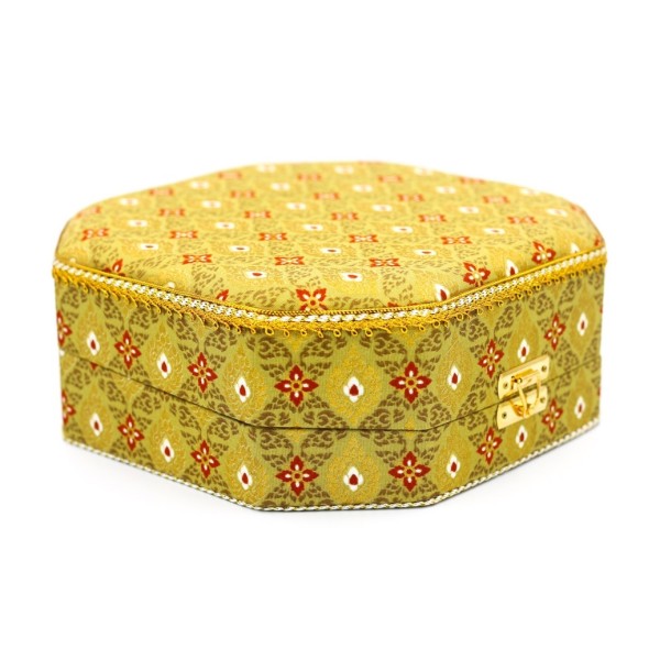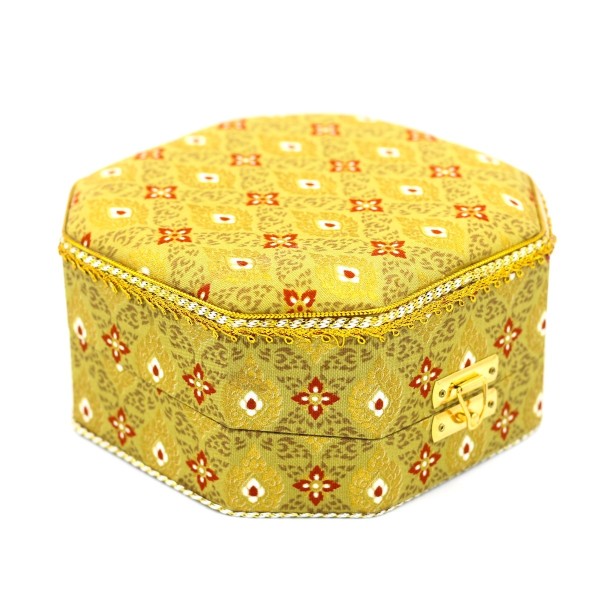 ชุดกล่องใส่ของอเนกประสงค์ ใส่เครื่องประดับ ทรงแปดเหลี่ยม จำนวน 3 ใบ ทำจากผ้าพิมพ์ทองลายไทย งานฝีมือหัตถกรรมไทย 100% ผลิตโดยพิพิธภัณฑ์เรือนไทย จังหวัดกำแพงเพชร