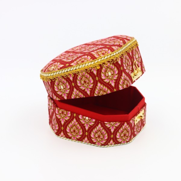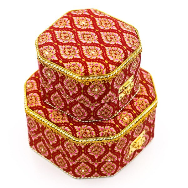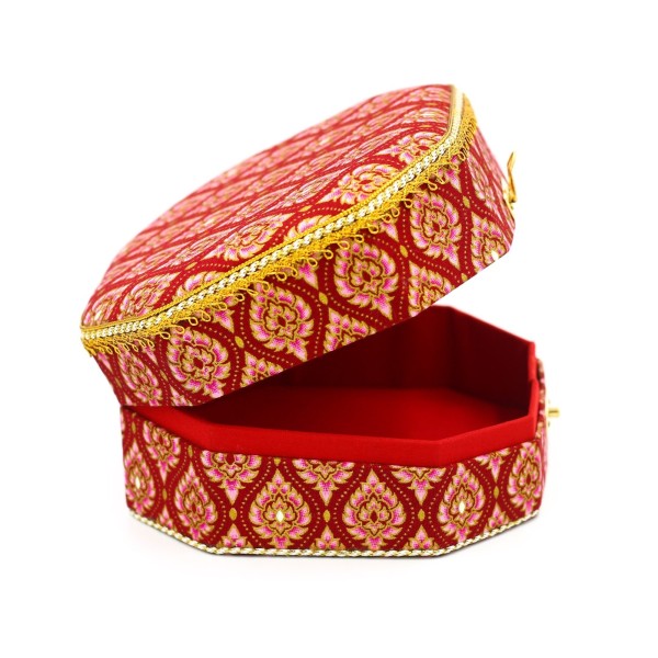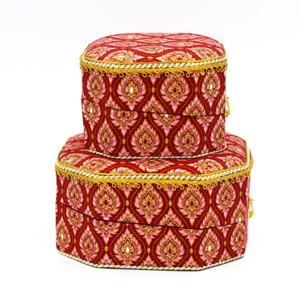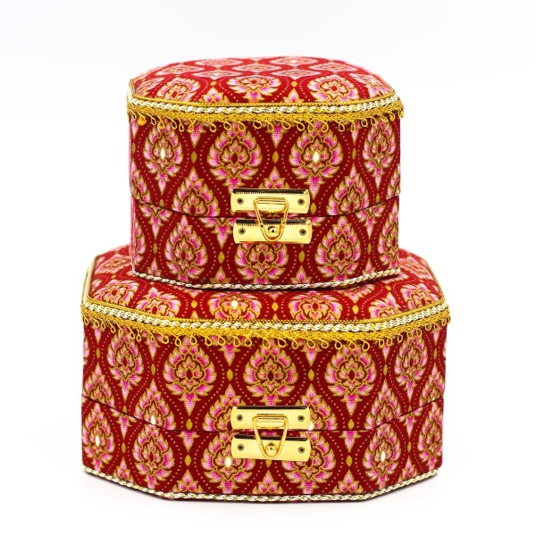 ชุดกล่องใส่ของอเนกประสงค์ ใส่เครื่องประดับ ทรงแปดเหลี่ยม จำนวน 2 ใบ ทำจากผ้าพิมพ์ทองลายไทย งานฝีมือหัตถกรรมไทย 100% ผลิตโดยพิพิธภัณฑ์เรือนไทย จังหวัดกำแพงเพชร