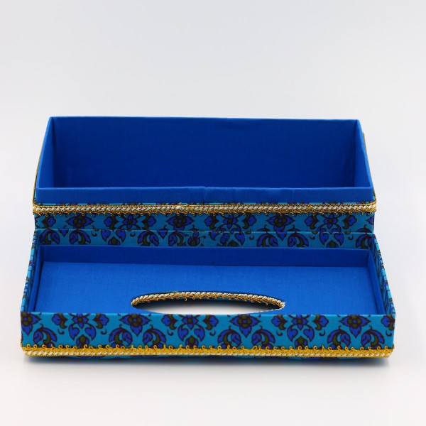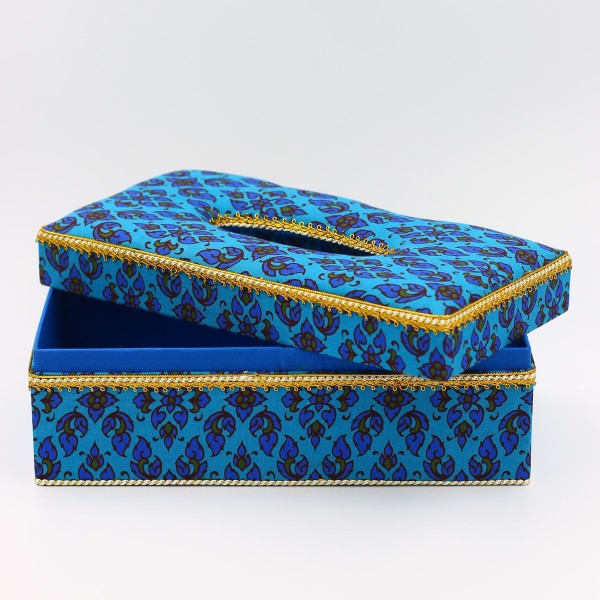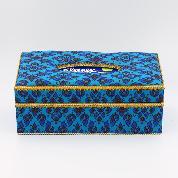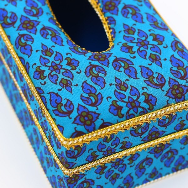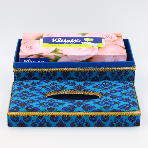 กล่องใส่กระดาษทิชชู ผ้าพิมพ์ทองลายไทยสีฟ้า