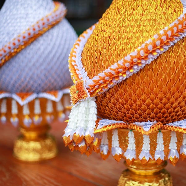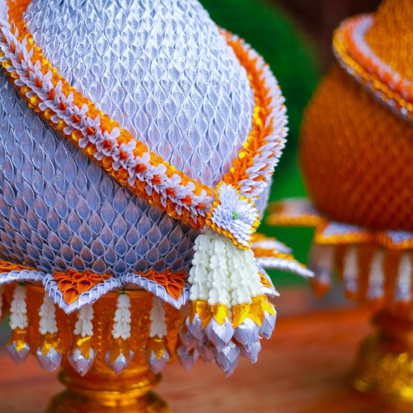 พานพุ่มผ้าสีเงินและสีทอง สำหรับถวายพระพร หรือ ประดับข้างพระพุทธรูป