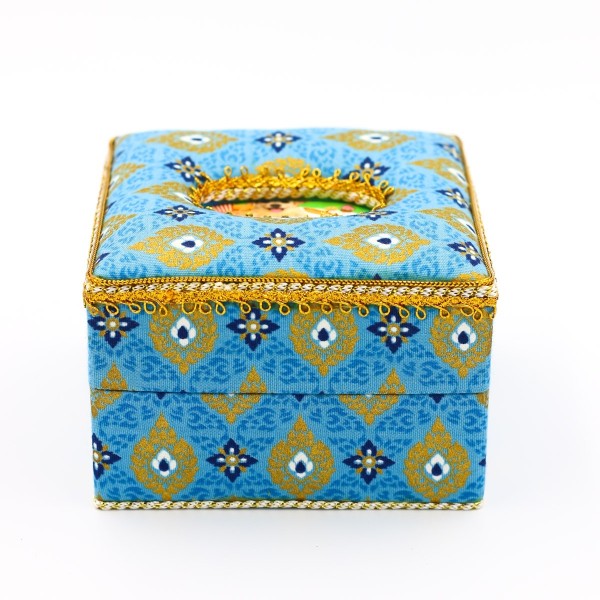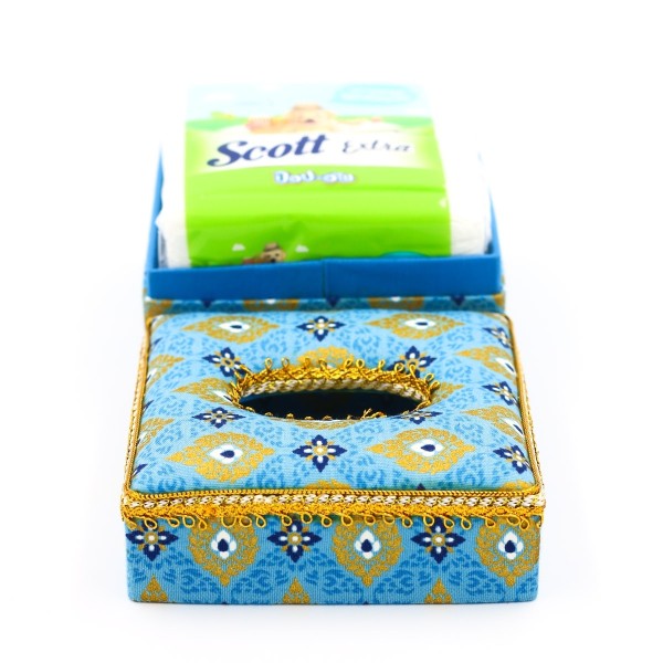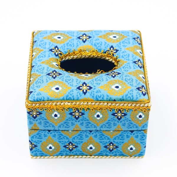 กล่องกระดาษทิชชูป๊อปอัพ ผ้าพิมพ์ทองลายไทยสีฟ้า