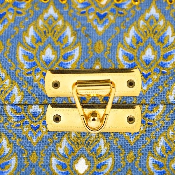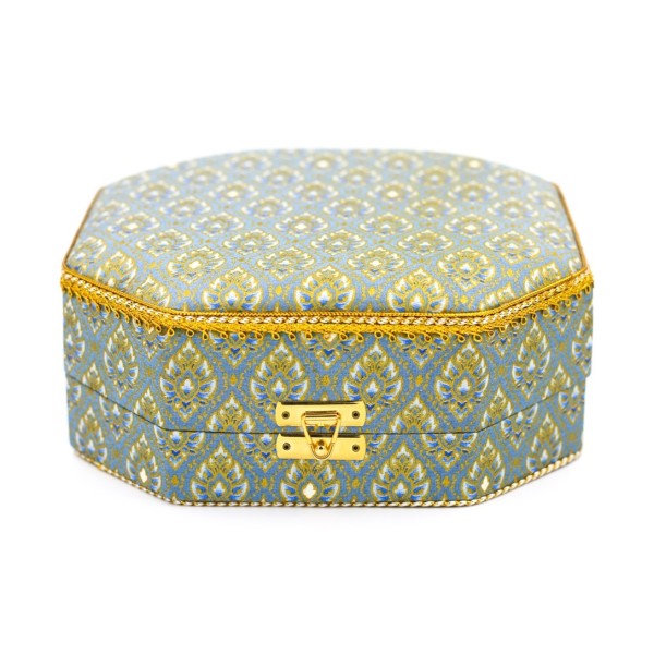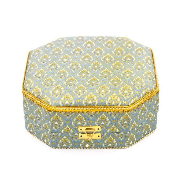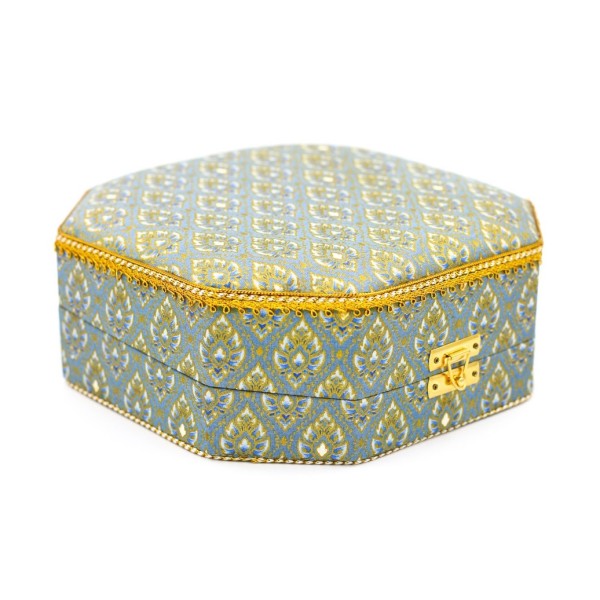 กล่องแปดเหลี่ยมใหญ่ ผ้าพิมพ์ทองลายไทยสีฟ้า
